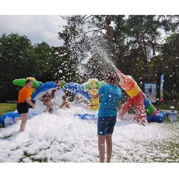 De DJ telt af…… Het feest kan beginnen. Het schuim spuit meters ver uit de schuimraket en als een douche van schuim vult het Bubble Park Dolphins zich.