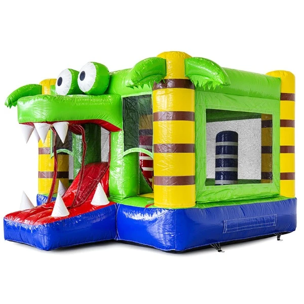 Dit blije springkussen met als thema krokodil heeft 2 speel objecten en een glijbaan.